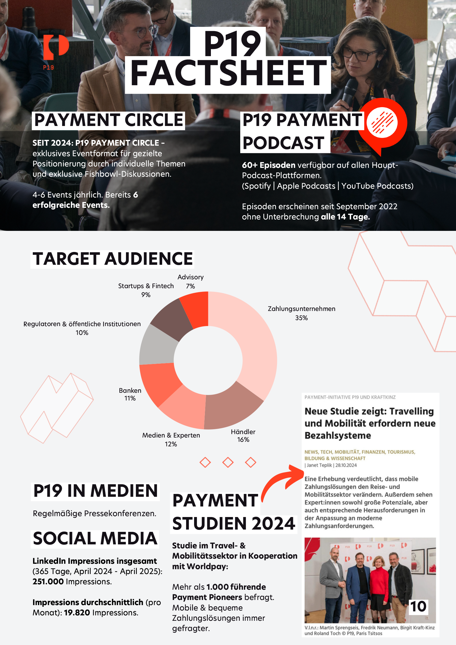 The Payment Festival is the flagship event and highlight of P19. On 26 November, Vienna's Sofiensäle will once again become the meeting place for everyone who shapes and advances the payment industry – with high-calibre panels, interactive fishbowl discussions and exciting keynotes from international speakers and experts from industries such as business, finance, tourism, mobility and retail.
